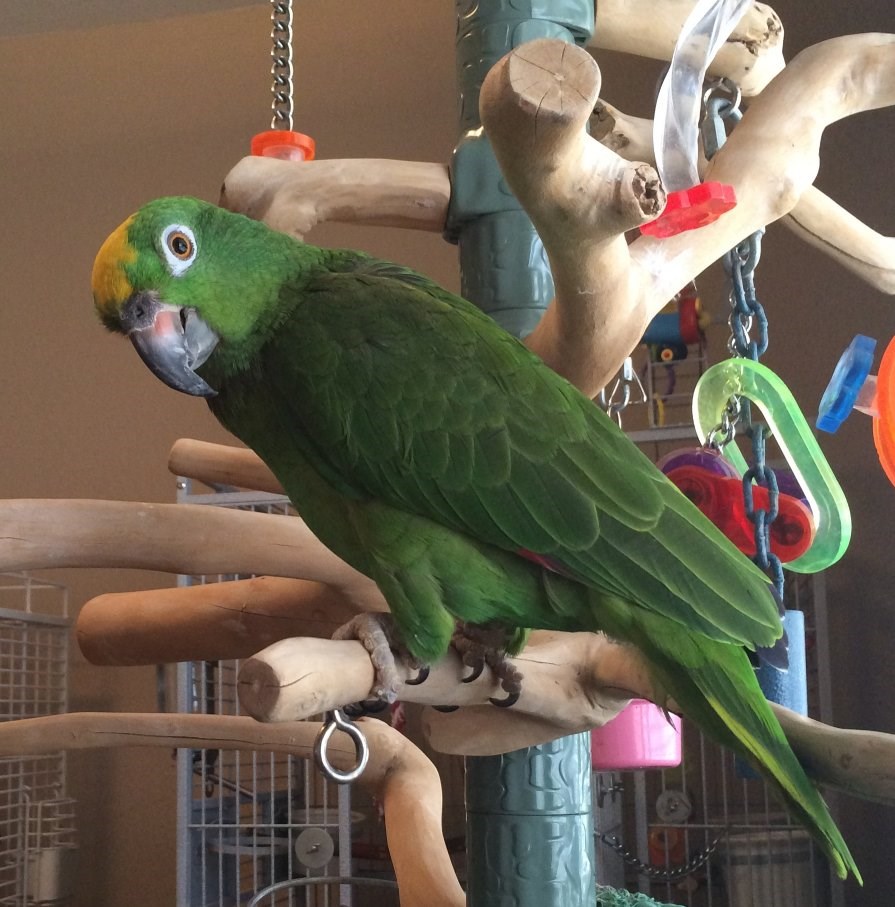Felix is a 21 year-old DNA female yellow-crowned Amazon, and as much as we hate to admit it, she is very much a woman’s bird. She believes in peaceful coexistence with the man of the house, but she would prefer that a male not “violate” her space and will usually exit stage left when approached by a man. Oh, but you can live with that! In true Amazon fashion, this girl is a great eater, enjoying Zupreem pellets, fruits, veggies and nuts. She likes almonds as snacks, and Avicakes and Nutriberries really get her attention. Her favorite comfort food is mashed potatoes with mixed vegetables. A real entertainer, Felix cackles like a chicken, crows like a rooster, and sometimes calls for Oscar (her clutch mate); apparently, then, she has a good memory for names! She also occasionally says “Momma.” In her previous life, she did befriend a Goffins cockatoo, and we assume she would be capable of replicating that friendship if the conditions were right. Though she will step up to come out of her cage, it’s usually preferable that she go back on a stick because she may not be in the mood to return, as she hates missing out on any fun. Felix is a low-maintenance, experienced pet, who does like to cuddle with her main person. Her adoption fee is $400, which includes her cage.