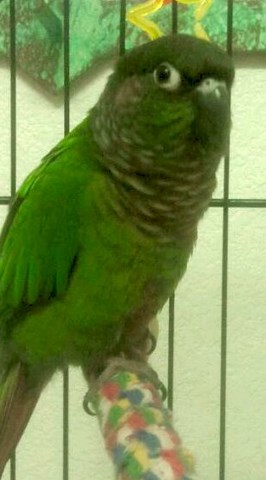 Howie is a 7-year old Green Cheek Conure, whose family had to rehome him, much to their dismay. He hails from a household that had two other small birds. Due to a change in everyone's work schedule, the family feared Howie was getting the short end of the perch, and he was letting them know it! He's a cute little guy, who loves to chatter and whistle and actually says a few things: "Whatcha doin'", "pretty bird," and "thank you." Obviously, Howie is polite! He always has a greeting for you when you approach his cage and loves being spoken to. He's a bit hand shy, but we think he will get over that fast once he settles in. Howie has a good appetite and particularly enjoys veggies and different fruits, including especially mango, apple, and kiwi. He also likes french fries, crackers, broccoli and carrots. Howie comes with a size-appropriate cage, which he likes quite well; he is rather active with his toys, and he loves his ladder. Howie's adoption fee is $185.00, which includes his cage.
