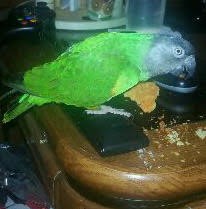 SADO (pronounced "Sah-doe"; Sado is one of Japan's largest islands) is an 18 year-old DNA-sexed Senegal parrot, who was only four months old when his owner acquired him. Sadly, her main person, who loves Sado very much, has now been diagnosed with a debilitating health issue that makes it impossible to care for Sado any longer. He describes Sado as having been a great pal for all these years, and we're sure Sado will make a wonderful companion for the person who appreciates a bird with lots of personality and spunk. Though she doesn't talk much, Sado is quite animated an interactive and she loves to be with her human; she also likes to break bread with people and has become quite the gourmet omnivore. In addition to bird food, Sado has developed a fondness for shrimp, pork, beef and chicken (all well-cooked, please!), and likes an occasional Cheese-it or corn chip as a snack while watching TV. Salty snacks, of course, should be served in VERY limited quantities. Sado steps up nicely and enjoys being scritched on the head during quiet times. She has been known to enjoy an occasional fly-by; she also likes walkabouts on the countertop. Sado's adoption fee is $315 and include a size-appropriate cage