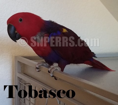 Tobasco aka "Chili" is a female Eclectus Parrot. Her foster family says she is fairly quiet but is known to say a few words like 'Hello' and 'Good Morning'.Tobasco comes with a cage and her adoption fee is $400